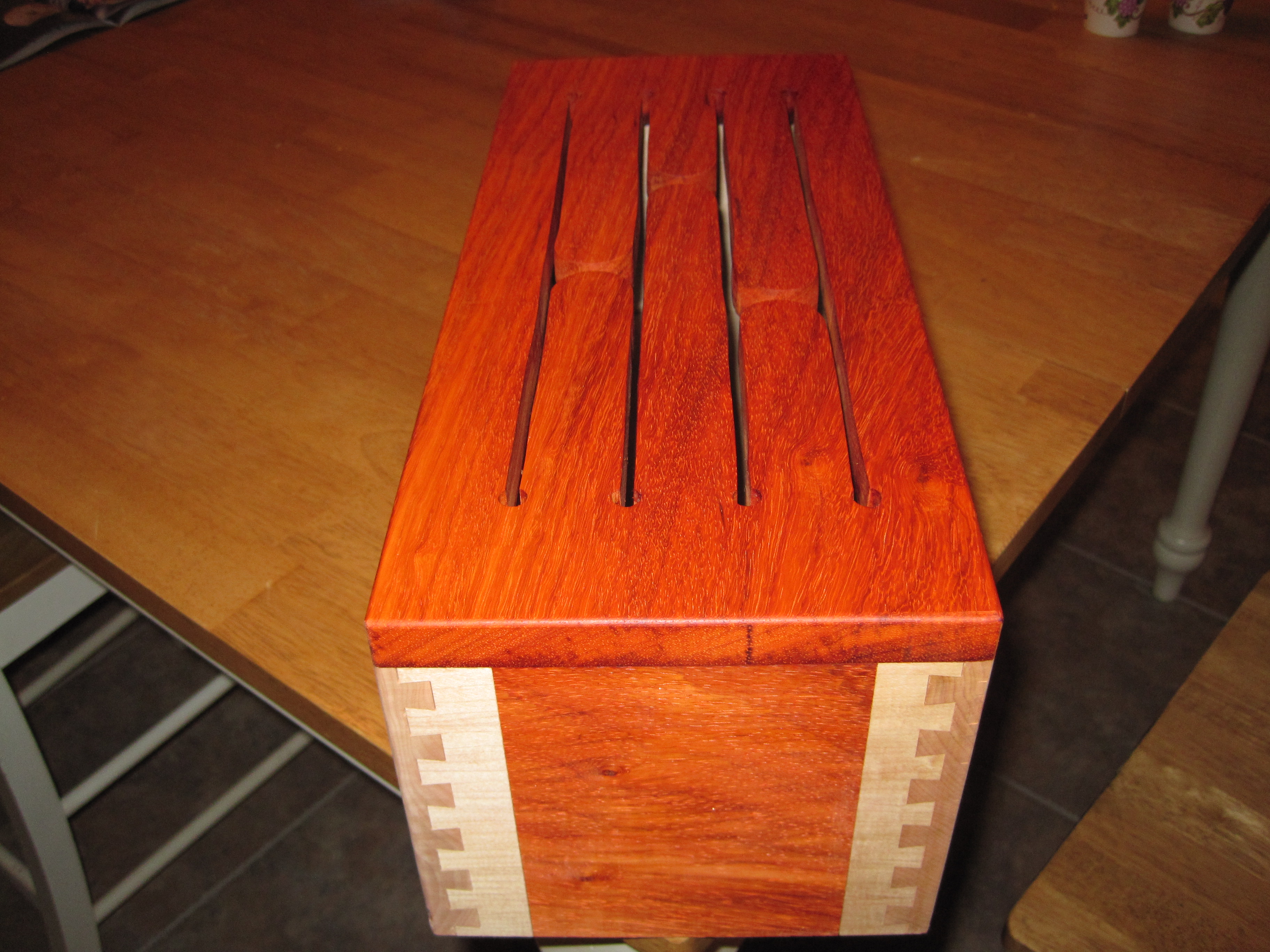 But wait, there’s more!  I also got to practice with my Porter Cable dovetail jig.  It was here I made my first big mistake on the project.  If you don’t double-check yourself it’s real easy to get the pieces on a project mixed up.  I ended up cutting tails where there should have been pins and pins where there should have been tails on two boards.  Duh!  And, “woodn’t” (pun intended) you know, I didn’t have any extra Maple.